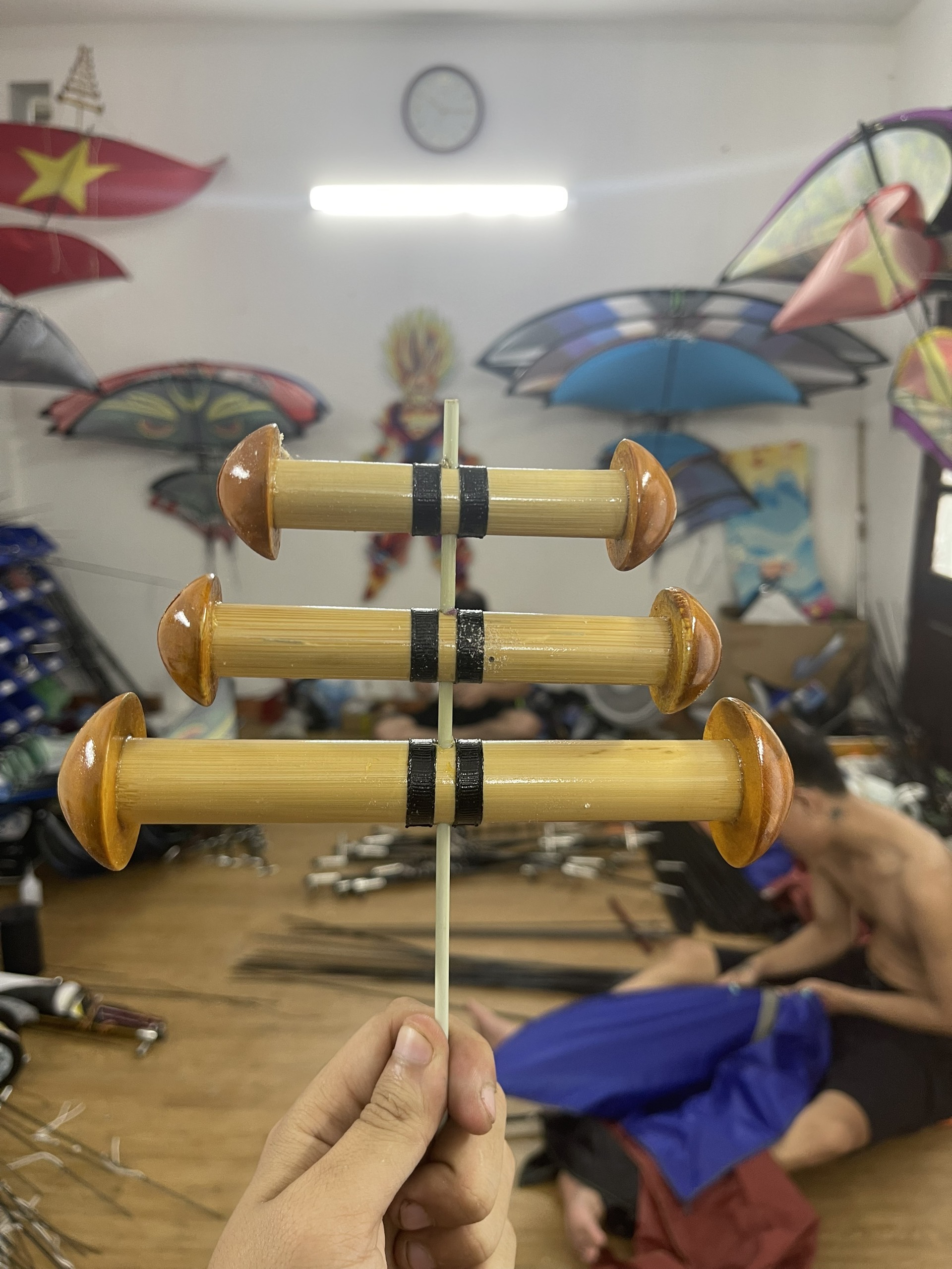 - BUỘC SÁO bằng cách lấy 4 dây chằng, hai dây ở phía trên buộc từ sáo to nhất vào khoen sáo ở diều và hai dây chằng sau từ ống sáo vào nan cánh dưới của diều (quét mã xem hướng dẫn)
