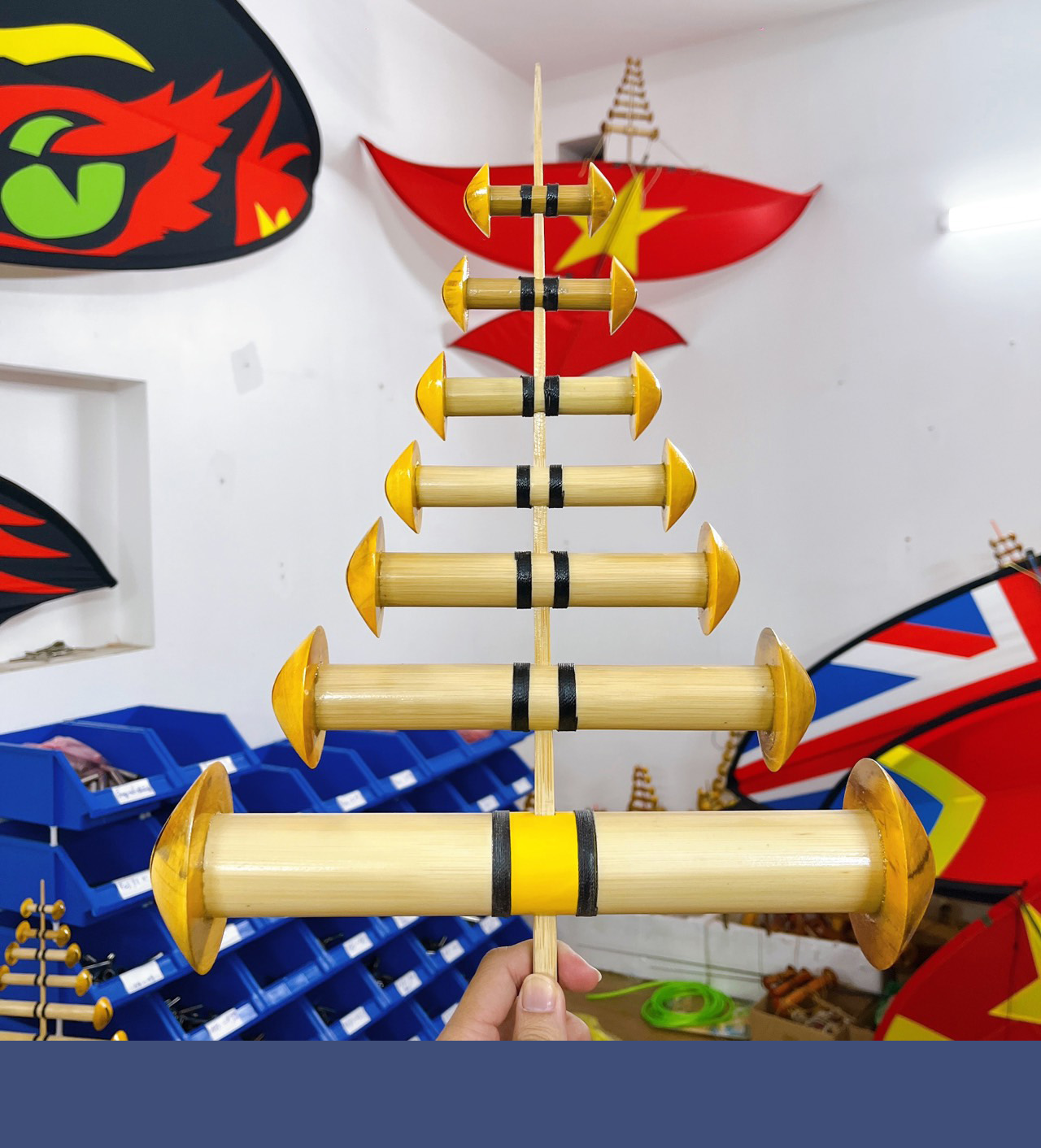 - BUỘC SÁO bằng cách lấy 4 dây chằng, hai dây ở phía trên buộc từ sáo to nhất vào khoen sáo ở diều và hai dây chằng sau từ ống sáo vào nan cánh dưới của diều (quét mã xem hướng dẫn)