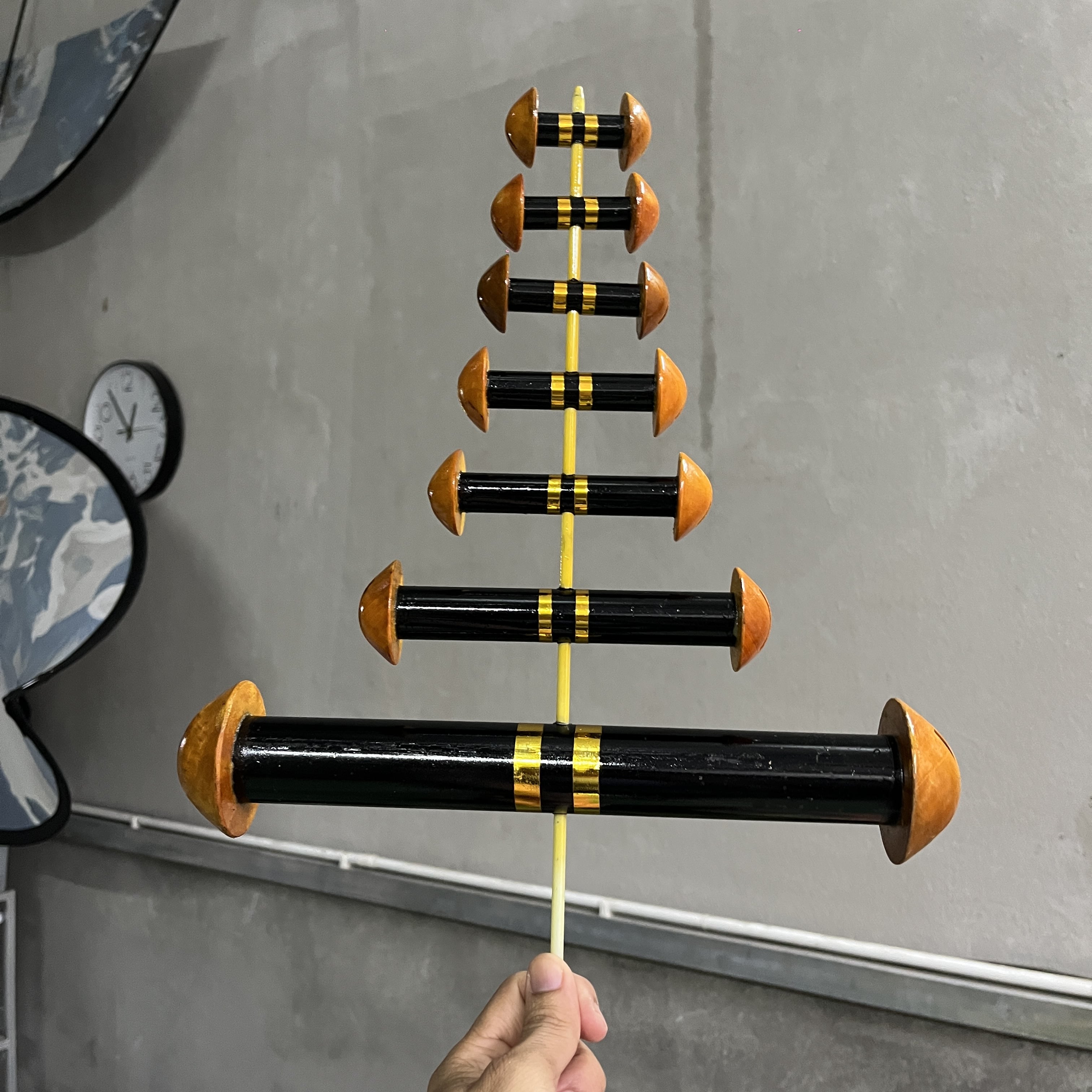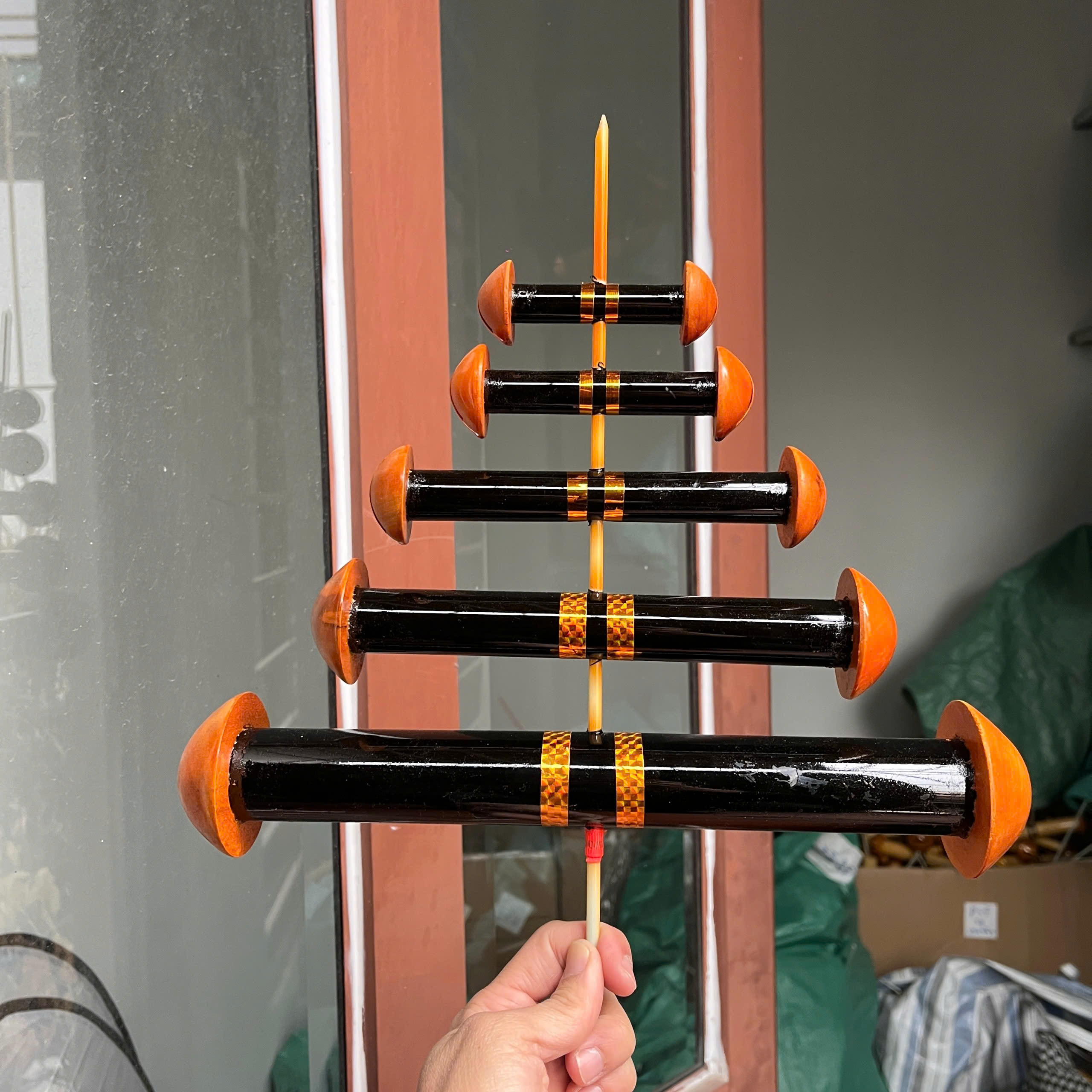 - LẮP SÁO bằng cách lấy các ống sáo từ to tới nhỏ lắp vào cọc sáo để cách đều nhau sao cho ống sáo to nhất ở chặn dưới cùng, ống sáo nhỏ nhất cách ngọn một đoạn và nhỏ một giọt keo 502 vào mỗi lỗ cọc sáo đi qua.