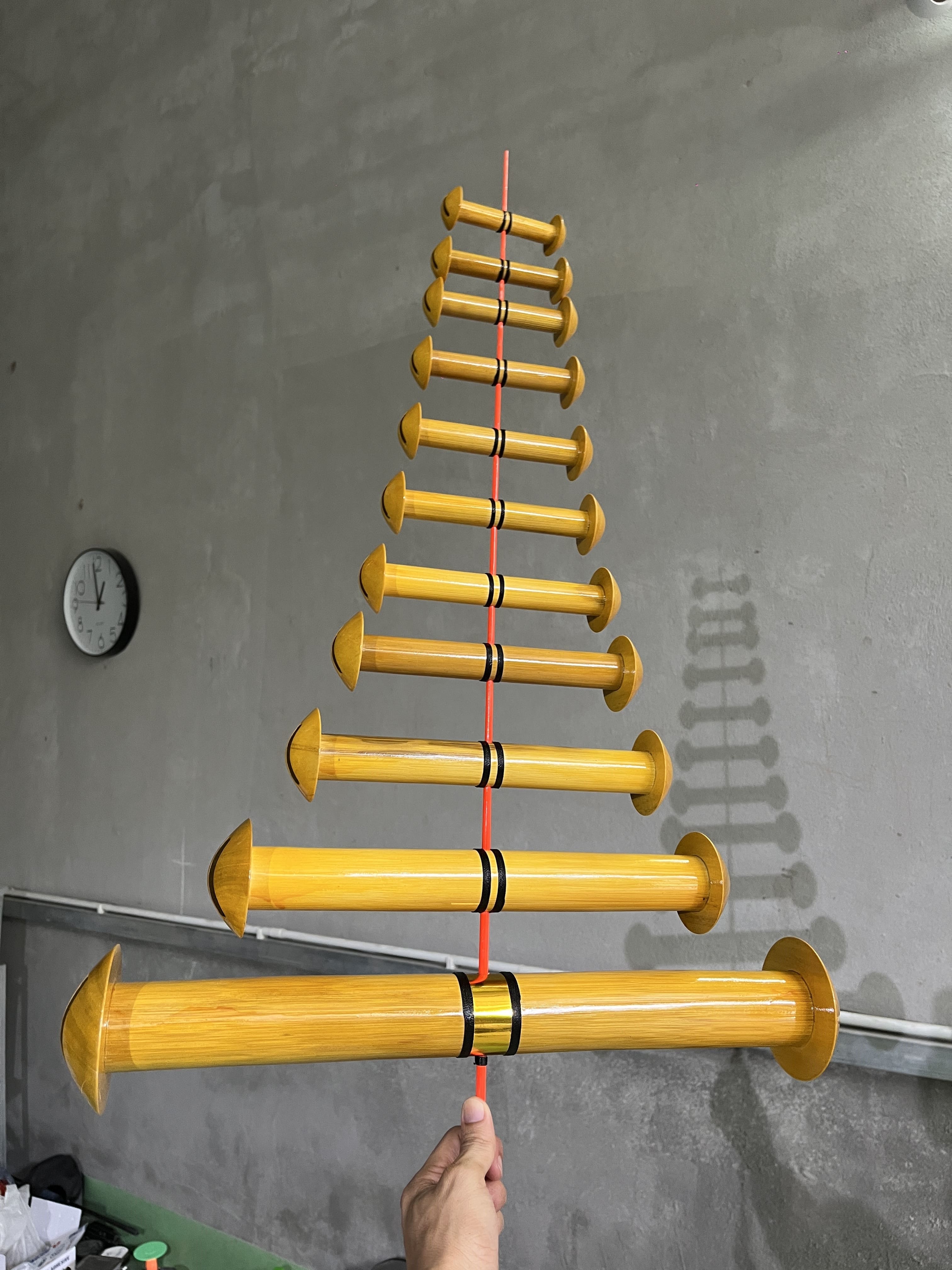 - LẮP SÁO bằng cách lấy các ống sáo từ to tới nhỏ lắp vào cọc sáo để cách đều nhau sao cho ống sáo to nhất ở chặn dưới cùng, ống sáo nhỏ nhất cách ngọn một đoạn và nhỏ một giọt keo 502 vào mỗi lỗ cọc sáo đi qua.